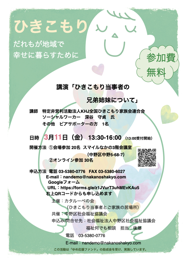 講演会 2022.3月11日 講演会 深谷守貞氏 2022.03.112024.08.31 ひきこもり当事者の兄弟姉妹について 深谷守貞 【当日記】 参加者:20名 スマイル中野3階 AB会議室 オンライン実施 親とも違う立場の家族が抱える問題についてお話し頂きました。 参加者の中には実際に兄弟姉妹の立場の方もいらして、「深谷氏のお話がとても参考になった」との感想を頂きました。