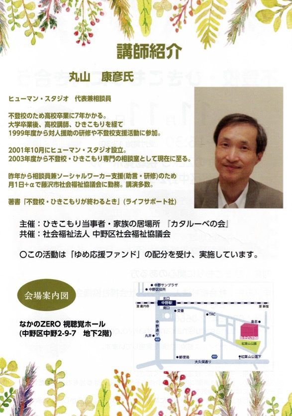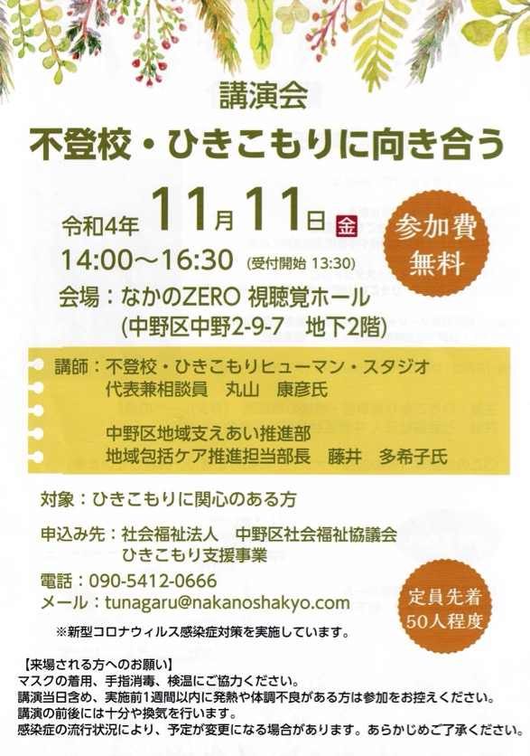 講演会 2022.11月11日 講演会 丸山康彦氏 2022.11.112024.08.31 不登校・ひきこもりに向き合う 【当日記】 参加者:56名 中野ZERO 視聴覚室にて ひきこもりだけでなく、不登校についてもテーマを広げたことで、実際不登校の子どもを持つ親の参加もあり、講演会後には、メールでの質問も寄せられ丸山氏に対応して頂いた。