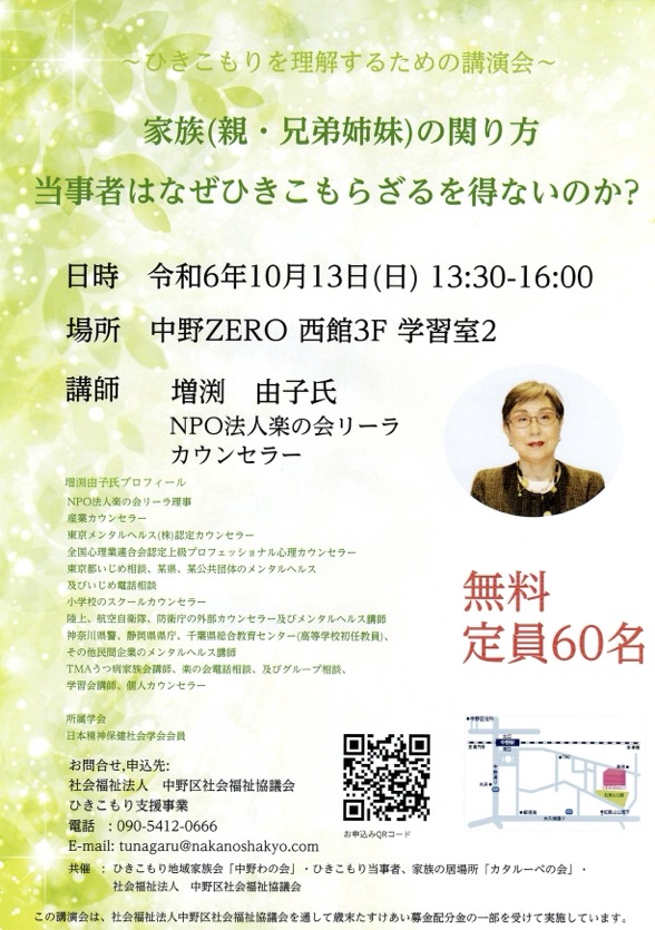 講演会 2024.10月13日 講演会 増渕由子氏 2024.10.012025.03.27 NPO法人楽の会リーラ カウンセラー 増渕由子氏による 講演会開催致します。 増渕様は、ひきこもり当事者や家族へのカウンセリングに長年 関り、家族相談も担当されていらっしゃる方です。 参加費無料です。 是非ご参加下さい。 < 当日記 > 講演会参加者 55名