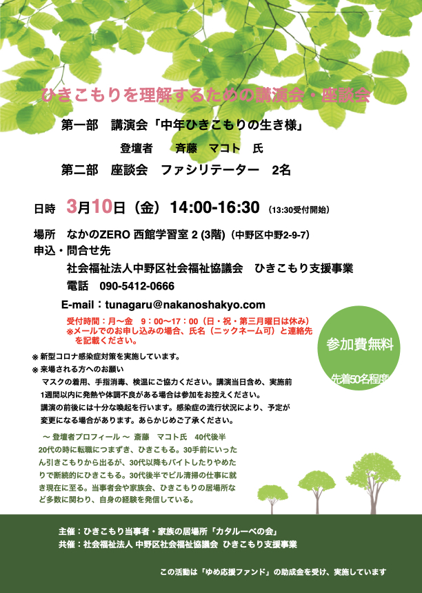 問合せ 社会福祉法人 中野区社会福祉協議会 ひきこもり支援事業