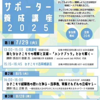 大会 ひきこもり合同相談会 ひきこもり状態にある人やその家族を支援するために、地域で活動するひきこもりサポーターを目指す「ひきこもりサポーター養成講座」を開催します。公開講座と同日に、ひきこもり支援を行う団体や機関が集まる「ひきこもり合同相談会」も実施します。ひきこも... 2025.07.17 大会